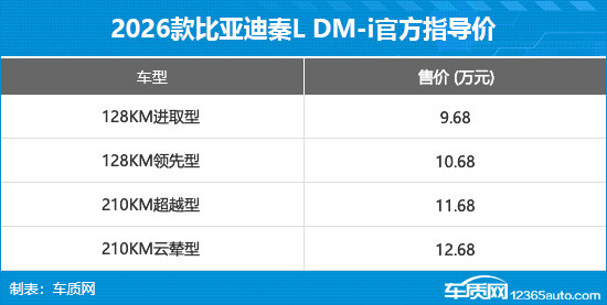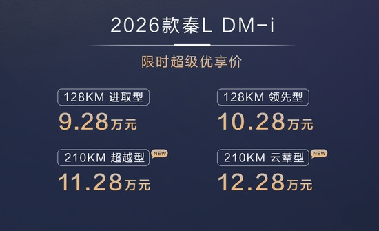 1月8日,2026款比亚迪秦L DM-i正式上市,新车共推出4款配置,官方指导价为9.68-12.68万元,同时还提供限时超级优享价,价格区间为9.28-12.28万元。本次年度改款的核心变化集中在续航与配置层面,新增210km长续航版本,电池容量提升至25.28kWh,并同步带来多项舒适与底盘技术升级。