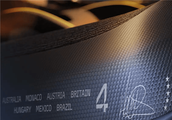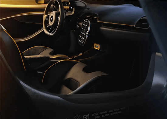内饰以Carbon Black Alcantara和Jet Black Nappa真皮包裹,橙色缝线点缀细节。座椅头枕、方向盘带有专属标识,门槛饰板印有两位车手的亲笔签名及2025赛季高光分站信息,中控下方镶嵌限量标识。