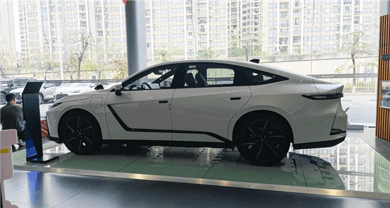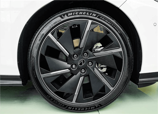 车侧部分,车顶线条采用溜背式设计,整体线条十分修长,运动感更强。新车的充电口在前翼子板处,车门把手采用半隐藏式设计,轮毂为21英寸规格,并搭配235/45 R21的米其林轮胎。