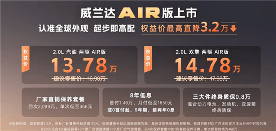 日前,广汽丰田焕新推出威兰达Air版车型,同步上线新春专属购车福利,2.0L汽油两驱Air版限时权益价13.78万元起,2.0L双擎两驱Air版14.78万元起,相较建议零售价最高直降3.2万元,优惠力度拉满。