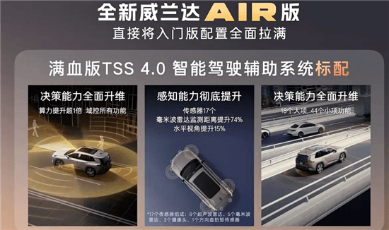 Air版将入门版配置全面升级,标配满血版TSS4.0智能驾驶辅助系统,由17个传感器组成,感知与决策能力大幅提升;车内配备15.6英寸中控屏,搭载丰田中国团队自研智能座舱,支持多屏互联与手势控制,高级皮质座椅、50W无线快充、64色氛围灯等均为标配。