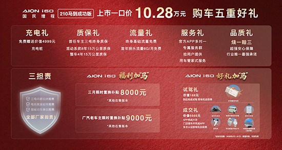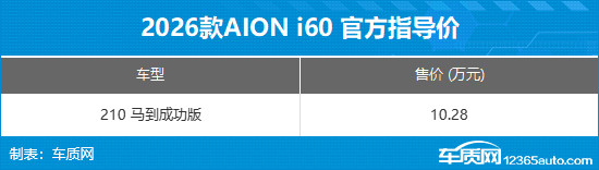 2026年3月2日,AION i60马到成功版正式上市,售价10.28万元。作为新增车型,其在保留配置与交互体验的同时,价格门槛进一步降低,性价比得到显著提升。官方不仅为新车提供充电礼、质保礼、流量礼、服务礼和品质礼的五重好礼,而且还推出了限时置换福利。3月入手AION i60其他在售版本可享8000元置换补贴,广汽老车主专享9000元补贴。