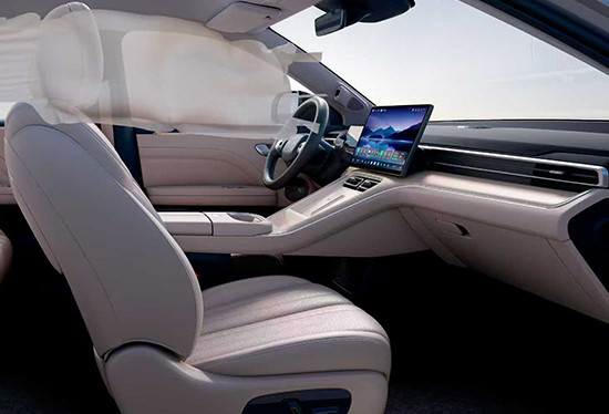 内饰部分,新车提供燕麦奶白、暖绒浅棕、大溪地灰三种配色方案可选。中控台造型简约精致,配备8.88英寸全液晶仪表盘及14.6英寸中控大屏,内置ADiGO车载智能系统,AI语音接入DeepSeek大模型,支持连续10条指令同时响应。