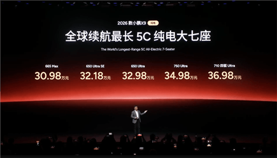 2026款小鹏X9纯电版正式上市,共推出五款车型,售价区间为30.98-36.98万元,续航起步为650km,最高为750km。