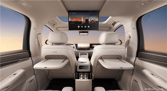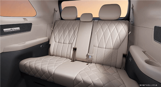 空间部分,第二排配备独立座椅,菱形的缝线高级感十足,座椅支持一键躺平功能。第三排座椅也可以电动调节,并拥有加热功能。配置上,第二排提供大尺寸的折叠屏、车载冰箱和小桌板等。