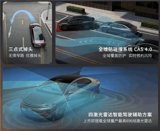 车辆搭载分布式三电机系统,系统总马力为598匹,百公里加速4.4秒;辅助驾驶硬件首搭华为896线激光雷达,与尊界S800属于同款软硬件,全车共有4个激光雷达,为满血版华为ADS 4.1系统。