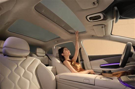座舱内部,全球首创悬浮式遮阳帘,创新性地将物理遮阳帘设计在天幕两层玻璃当中,整体更为美观、通透同时,还降低了打理难度,以及增加了头部纵向空间。