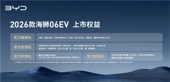 比亚迪2026款海狮06EV正式上市,新车定位中型纯电SUV,共推出4款配置,官方售价15.99-17.99万元。