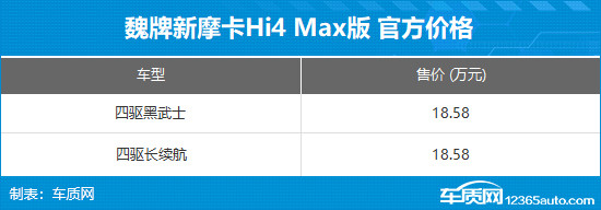 日前,车质网获悉,魏牌新摩卡Hi4 Max版已正式上市,新车推出四驱黑武士与四驱长续航两款车型,统一售价18.58万元。官方推出多重购车权益,4月30日前下订可享6000元增换购补贴,5年贷款前两年0息,首任车主2年内免费提供充电桩及基础安装服务,娱乐流量3年免费。
