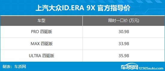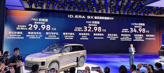 4月25日,上汽大众ID.ERA 9X正式上市。新车共推出3款配置车型,官方指导价为30.98-35.98万元,限时权益价29.98-34.98万元。同时,官方同步推出多重购车福利,涵盖超级置换礼、奢享升舱礼、终身质保礼、智行守护礼、安心补能礼、挚友同行礼、高定车漆礼、零压金融礼、无忧流量礼、尊享交车礼等。