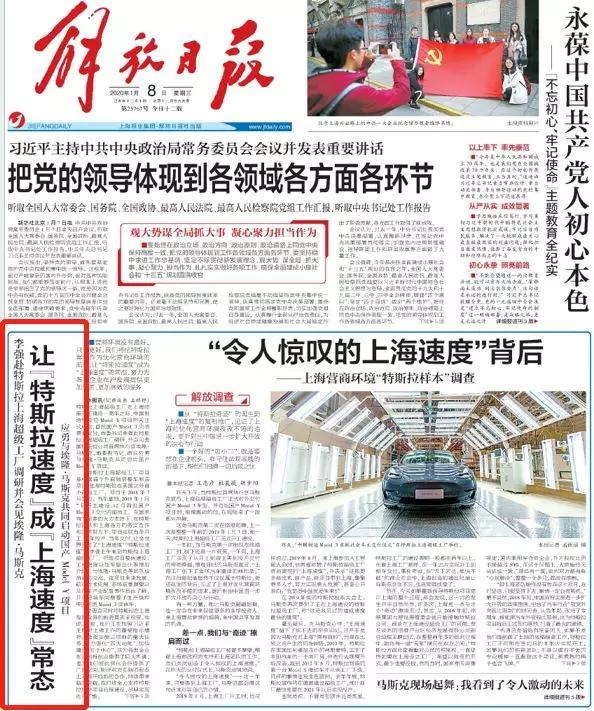 国产特斯拉Model3交车仪式第二天,上海市委机关报《解放日报》发表题为《让“特斯拉速度”成“上海速度”常态》的文章,称赞特斯拉上海工厂的项目进展。