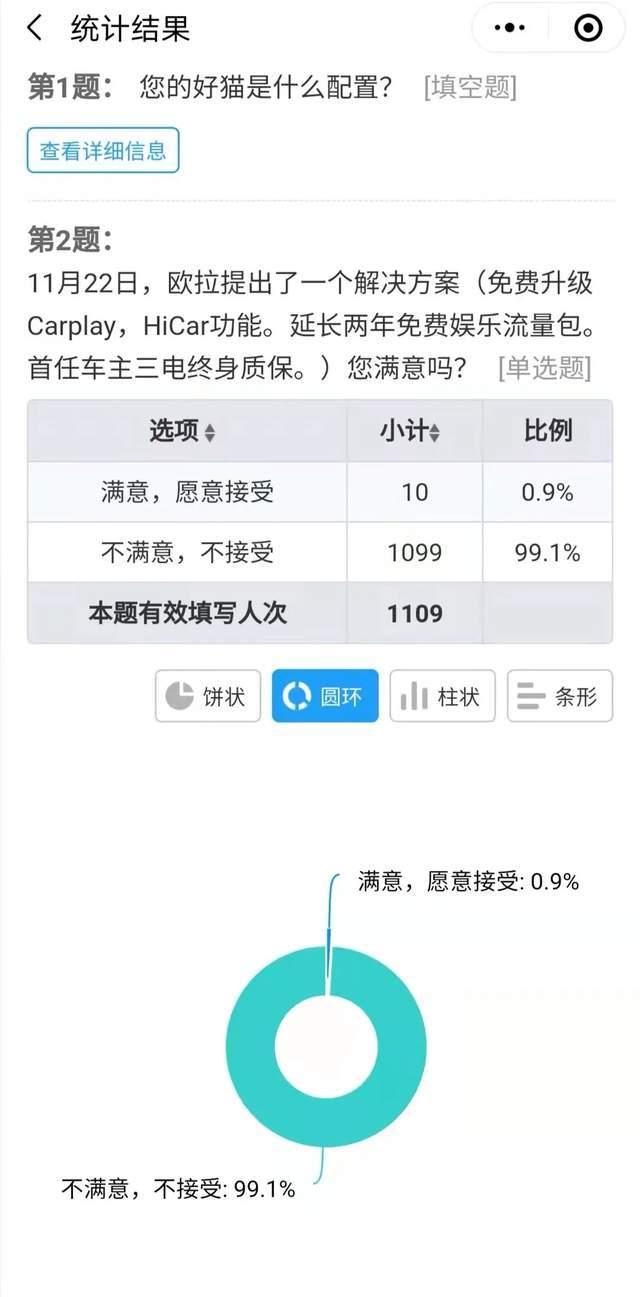 为了搞清楚好猫车主的真实态度和诉求,11月26日,我们在社群里发布了《好猫芯片事件车主真实诉求调查》,好猫车主把链接转到了不少好猫车友群,所以参与的人数比较多。截至11月28日,共有1109人参与了这次问卷调查。