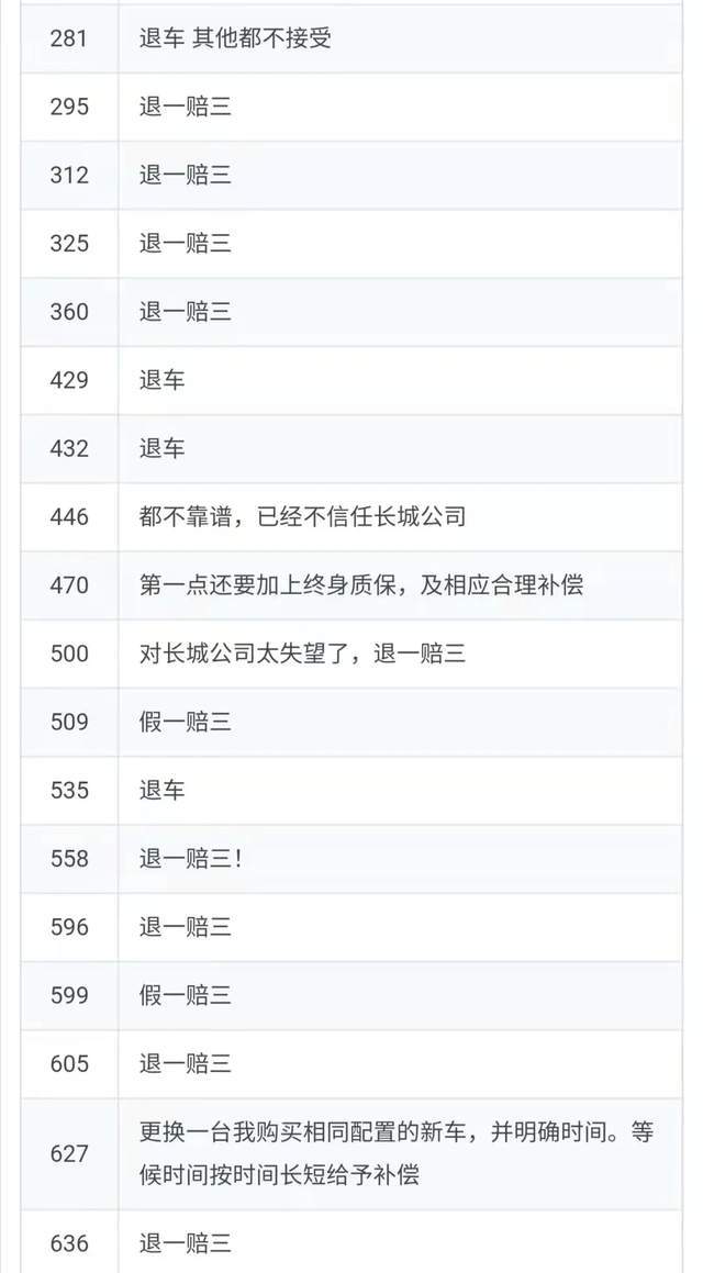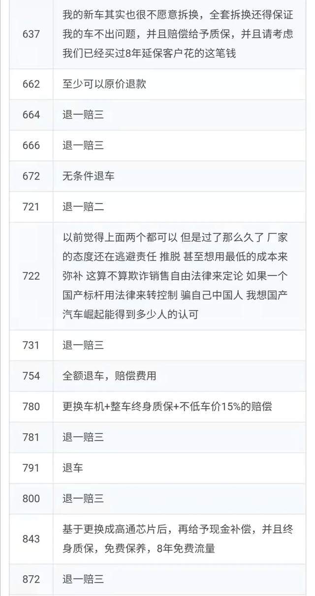 如上图所示,还有60人选择了其他选项,要求长城欧拉退一赔三的呼声比较高。我们在此仅摘录部分结果,如下: