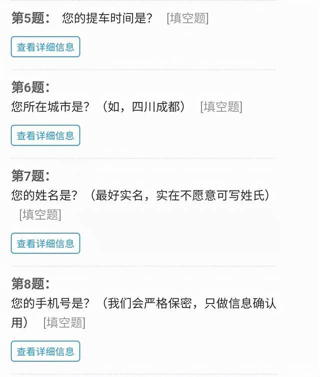 我们也收集了一些其他信息,如提车时间、地点、称呼以及联系方式。这些信息不在此赘述了,手机号属个人隐私,我们会严格保密,只做信息确认用。