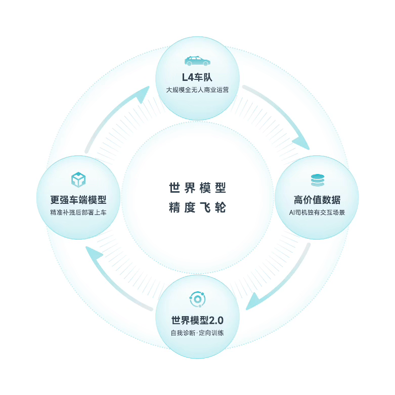 支撑这一进化的是一个自我强化的“精度飞轮”:大规模L4无人车队商业运营产生真实世界的高价值数据,用以提升世界模型精度,进而增强车端模型能力,支撑更大规模部署,由此形成闭环。