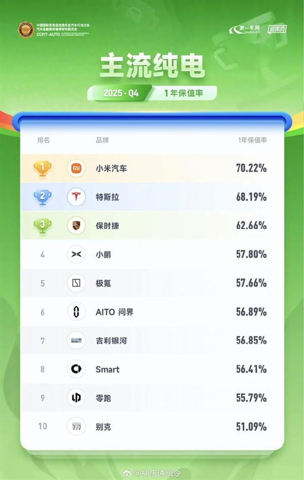 【TechWeb】根据保值率研究委员会发布的最新数据,在2025年第四季度主流纯电动汽车的1年保值率排名中,小米汽车表现抢眼,一举成为最保值品牌。