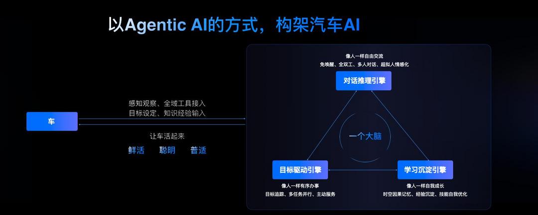 在新一代的汽车AI解决方案中,火山引擎将对话推理引擎、目标驱动引擎、学习成长引擎三大引擎融入统一的“汽车大脑”。