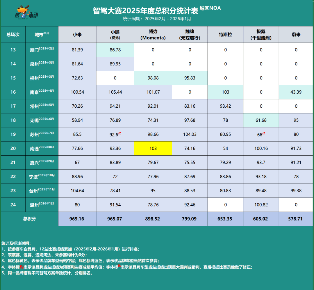 2025年度智驾大赛全年12站比赛,小米无一缺席。2025年11月台州站创下104.64分年内最高分,2025年6月无锡站拿到58.94分年内最低分,两站成绩过百,无一站冠军。最终以年度总积分969.16分(平均分80.76)的成绩,排名智驾大赛2025年度总积分榜第七。
