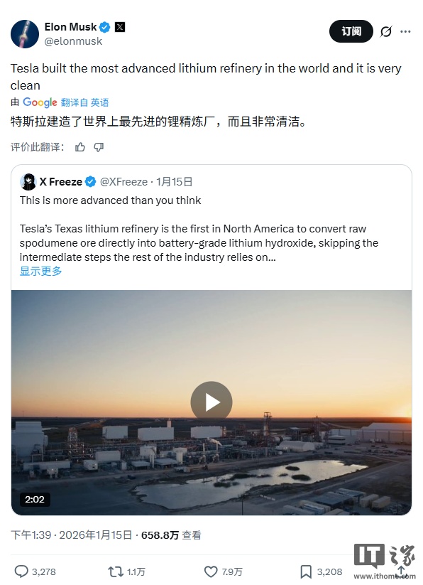 1月18日,特斯拉宣布其位于得克萨斯州的锂精炼厂正式投产,这是公司在美国电池供应链布局中的关键一步。该工厂能够将锂辉石原矿直接转化为