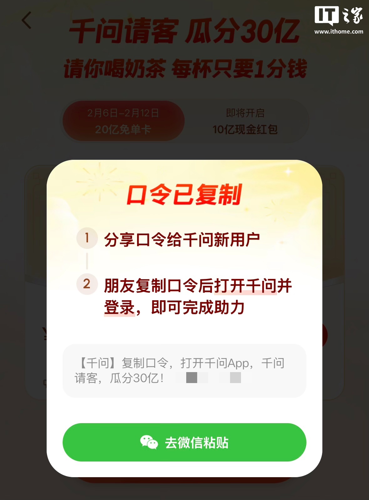 2月6日,阿里巴巴旗下的千问App推出了“春节30亿免单”活动,其中包括发放奶茶免单卡。用户在千问App中分享活动至微信好友时,系统已自动调整为复制口令形式,以规避微信的分享限制。此前,微信已经对腾讯元宝和百度文心助手的红包分享链接进行了屏蔽处理。今日,千问的红包分享链接也遭遇了微信的屏蔽,页面提示“存在诱导或误导下载/跳转的内容”,用户需要通过第三方浏览器访问。