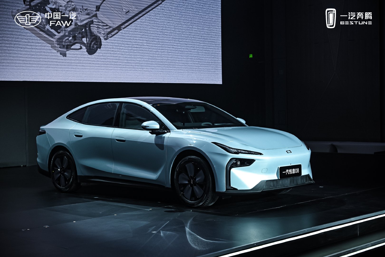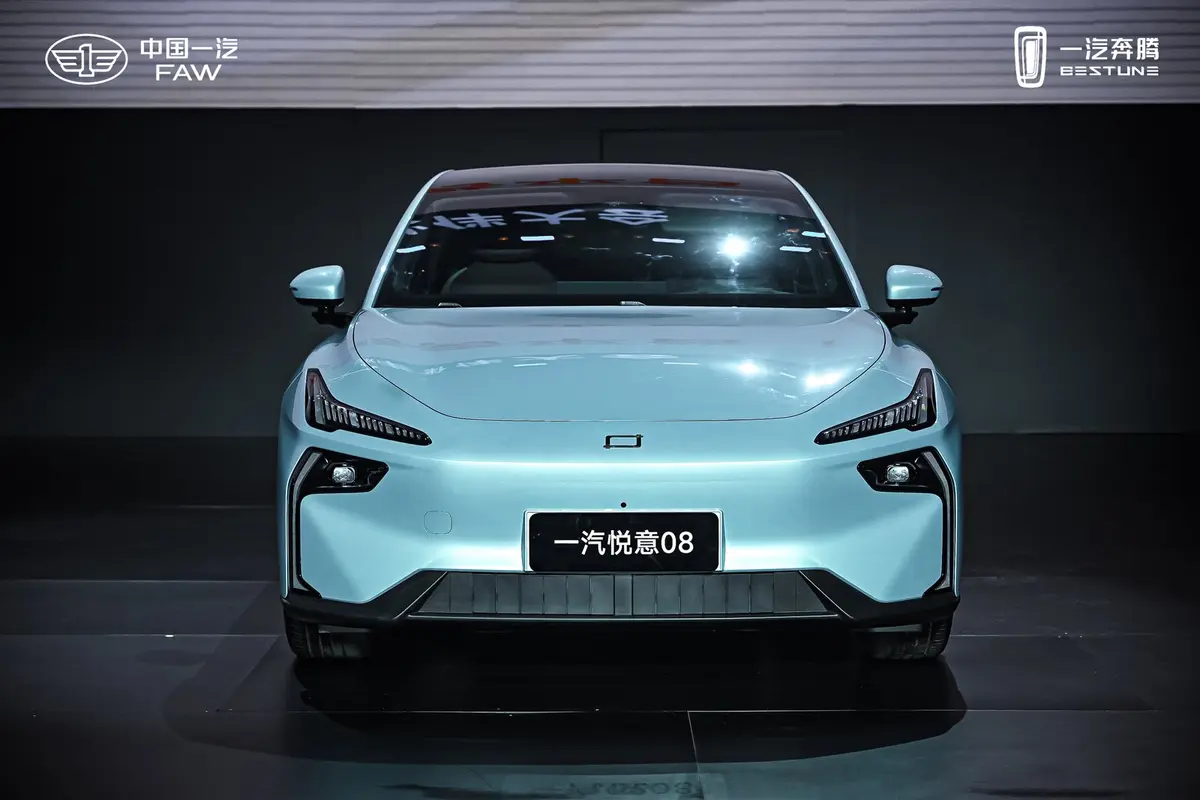 一汽悦意08的设计融合溜背轿跑造型、贯穿式尾灯和半隐藏式门把手,车头配备星河瀑布动态灯组,以增强辨识度。在技术配置上,实车展示显示其搭载激光雷达,并在智能座舱、充电速度、舒适体验及安全性能方面具备竞争力。动力方面,新车提供纯电与增程两种选项,其中已通过工信部申报的纯电版本电机最大功率为202千瓦。该车型于2025年11月完成申报,并在同年的上海车展亮相。一汽奔腾的产品矩阵分为E系、P系和R系三个系列,分别聚焦城市出行场景、定位“超级电混”产品,以及作为科技旗舰,面向“下一代全球风尚智能车”市场。
