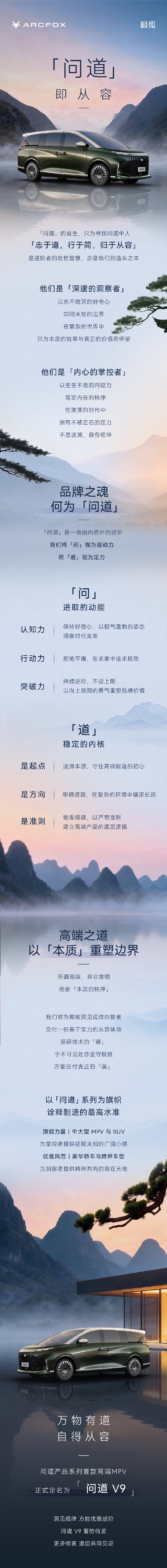 2月9日,北汽极狐品牌宣布其高端产品系列“问道”的首款MPV车型正式定名为“问道V9”。该车型以“志于道,行于简,归于从容”为设计理念,旨在为消费者提供高端的驾乘体验。问道V9在设计上强调了进阶动能与高端内核的结合,展现了品牌对于新能源汽车市场的深刻理解和创新追求。