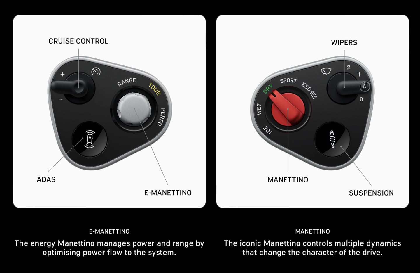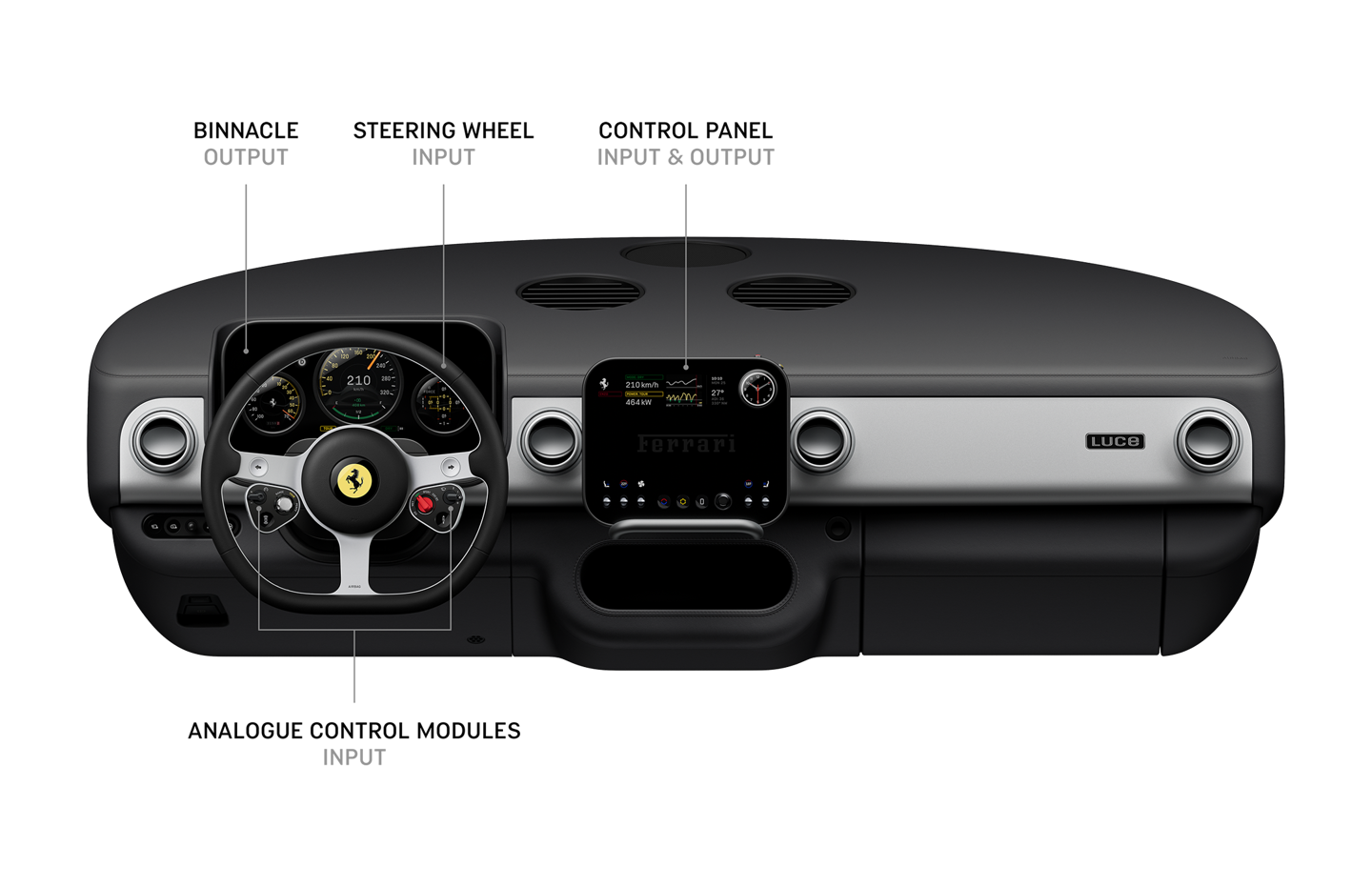 法拉利Luce的驾驶舱设计简洁统一,软件与硬件同步开发,实体结构与UI界面保持高度一致。方向盘采用简化三幅结构,灵感来自20世纪50-60年代的木质Nardi方向盘,整体分为两个控制模块,类似F1赛车。车内中控台特别设计,配备行业首发彩色E-Ink墨水屏钥匙,具有省电优点。车内共有三块屏幕,分别位于仪表盘、中控和后排,旨在提供明确、清晰、输入输出分离的使用体验。仪表盘屏幕内置两块重叠的OLED面板,由三星参与开发,中控屏幕带有球形转轴,可自由朝向驾驶员/副驾驶,配备掌托。