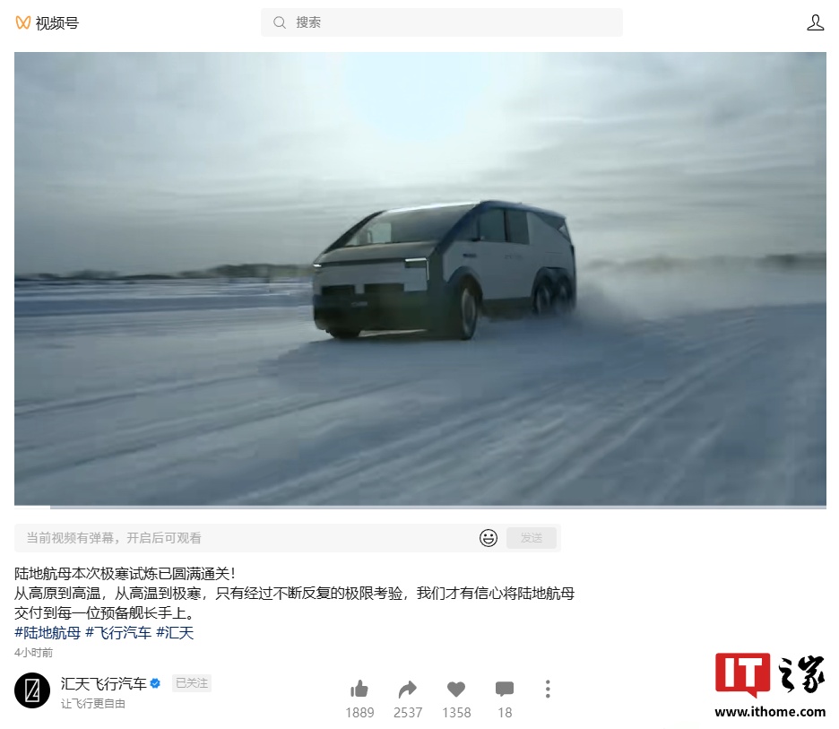 今日,小鹏汇天飞行汽车官方公众号宣布,其陆地航母飞行汽车在2026年1月成功完成了第三次冬测,顺利通过零下35℃的极限试炼。本次极寒测试在黑河上汽检测试场、牙克石博世测试场、长春榆树通用机场进行,旨在验证陆地航母在严寒条件下的动力、续航和交互可靠性。