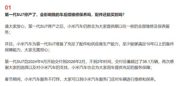 2月13日,小米汽车宣布初代SU7正式停产。自2024年4月开始交付至2026年2月停产,初代SU7在不到2年的时间里累计交付超过38.1万辆。针对老车主关心的维修保养问题,小米汽车官方表示,将继续为第一代SU7提供与以往相同的全部维修保养服务。公司已为第一代SU7准备了充足的配件和供应商生产能力,至少能够满足10年以上的备件保障能力。