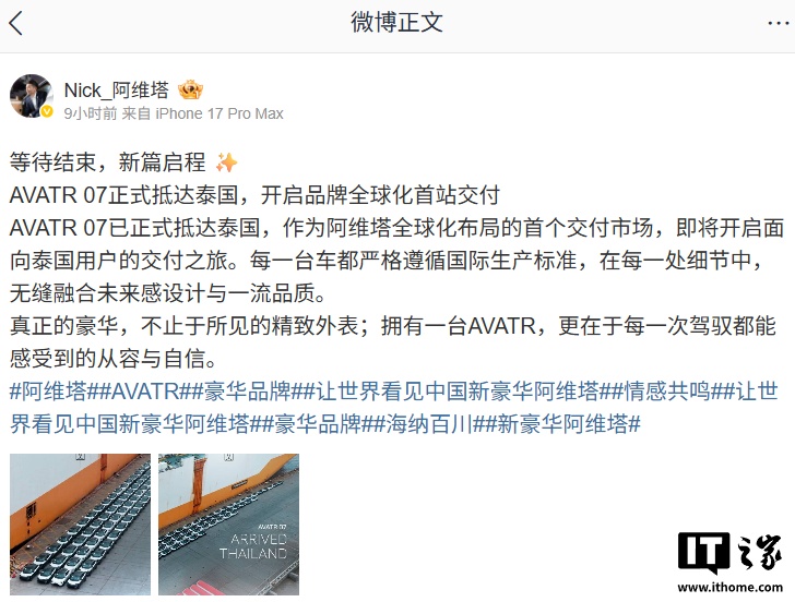 今日,阿维塔品牌在海外市场迈出重要一步,其海外营销高级总监Nick宣布,右舵版的阿维塔07正式抵达泰国,标志着品牌全球化首站交付的开始。去年9月,2026款阿维塔07车型在中国上市,该车型首次搭载了华为的乾崑ADS4