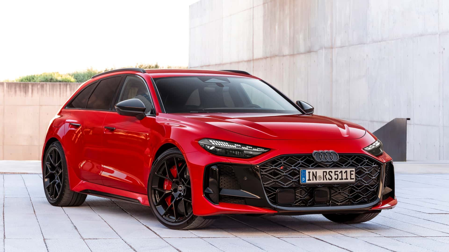 RS5 Avant整备质量2370kg,比前代重625kg,甚至比未电动化的RS6 Avant还重280kg。平台尺寸扩大也是重量增长的重要因素。外观方面,新车通过宽体设计与功能性进气口、居中布局的椭圆排气营造出强烈战斗感。前后轮拱加宽9cm,搭配20或21英寸轮毂与可选陶瓷刹车。矩阵LED大灯、黑色四环标识和带方格旗元素的OLED尾灯强化性能身份。车内延续奥迪一贯风格,三屏布局与触控操作依旧存在,蜂窝缝线运动座椅、按摩功能与RS专属方向盘按键提升氛围。新车还搭载Boost功能,可在10秒内释放最大动力。