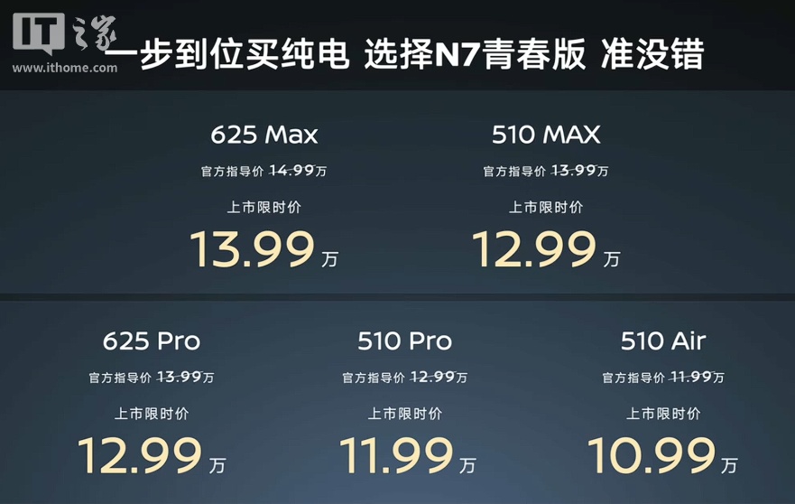 2月24日,东风日产春季新车发布会上,东风日产N7青春版纯电轿车正式亮相,官方指导价为11.99万元至14.99万元,上市限时价为10.99万元至13.99万元。该车型提供510km和625km两种续航版本,相较于前代N7,价格下调1万元,核心配置保持不变。N7青春版的车身尺寸为4930/1895/1487mm,轴距2915mm,510版本搭载160kW电机,而625版本则配备200kW电机。