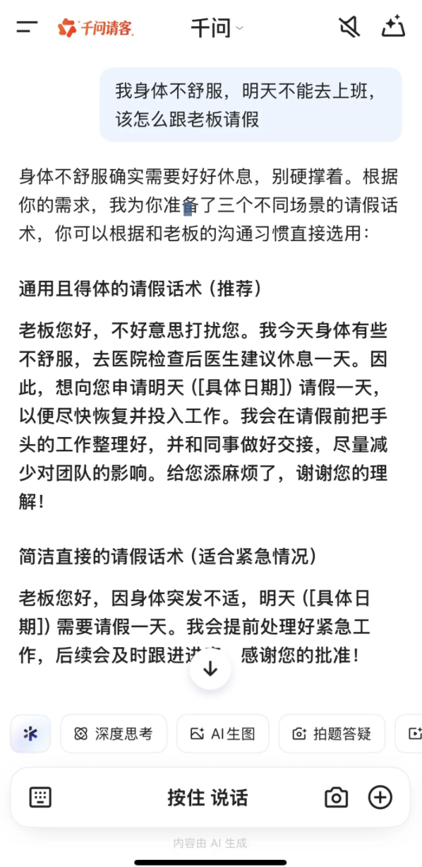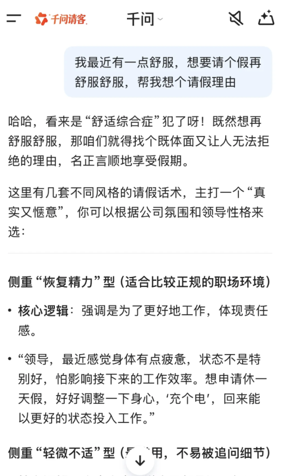 在请假条请求中,有一部分人选择了直接表达不想上班的实诚态度,而另一些人则以“可能要感冒”或“想要再舒服舒服”为由,展现出请假的创意和幽默。千问APP建议,如果实在不想上班,可以考虑将中秋、国庆假期和年假结合起来,组成长达17天的“拼好假”,以调整回工作状态。这一现象反映出人们在长假后对工作的适应和心态调整过程。