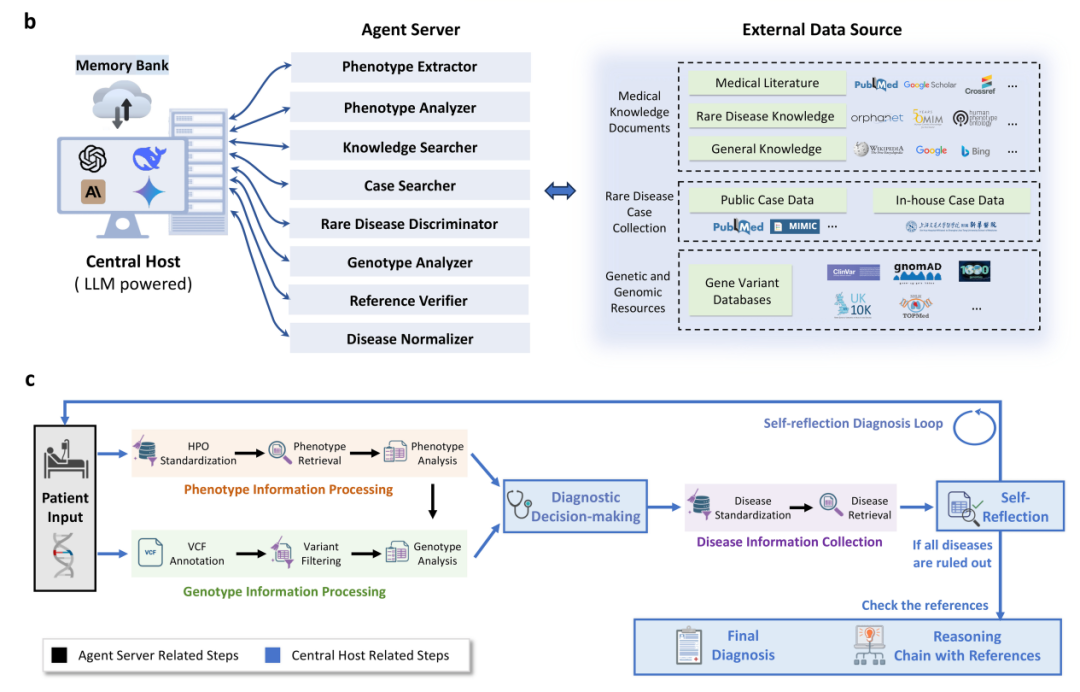 DeepRare系统通过“中枢-分身”可溯源AgenticAI架构,从知识储备、诊断思维和推理过程三个维度实现了对传统医疗AI的代际超越。系统能够实时整合海量医学文献知识库与真实临床病例数据,具备人类医生的“慢思考”能力,通过“假设-验证-自我反思”的迭代循环推敲诊断线索,并实现全流程白盒推理,每个诊断结论都附带完整证据链条。
