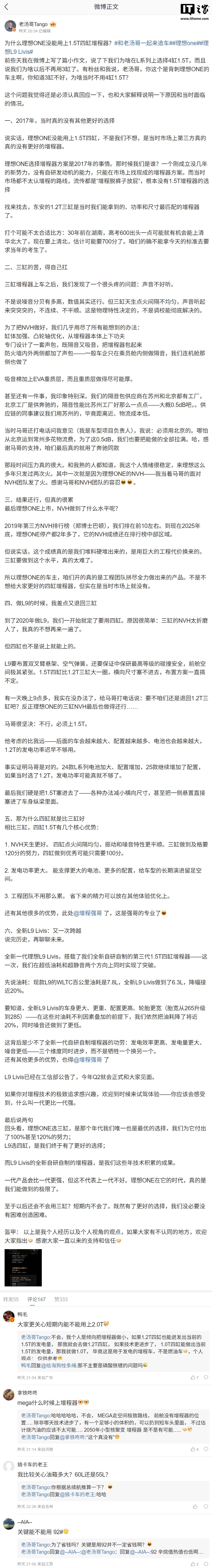 汤靖透露,到了2020年开发L9时,团队决定使用四缸增程器,因为三缸的NVH问题太过复杂。四缸增程器具有更好的NVH表现、更大的发电功率,并且可以使工程团队的工作更为轻松。他强调,理想ONE选择三缸增程器是当时的最佳选择,而L9选择四缸增程器则是因为有了更好的选择。汤靖还确认,理想汽车短期内不会使用2.0T增程器,而是倾向于将增程器做得更小,如果技术进步使得更小排量的四缸增程器能提供与1.5T相同的发电量,他们会选择更小排量的增程器。此外,他还提到理想MEGA不会采用增程器,因为其设计路线追求空间极致,前舱没有增程器的位置。