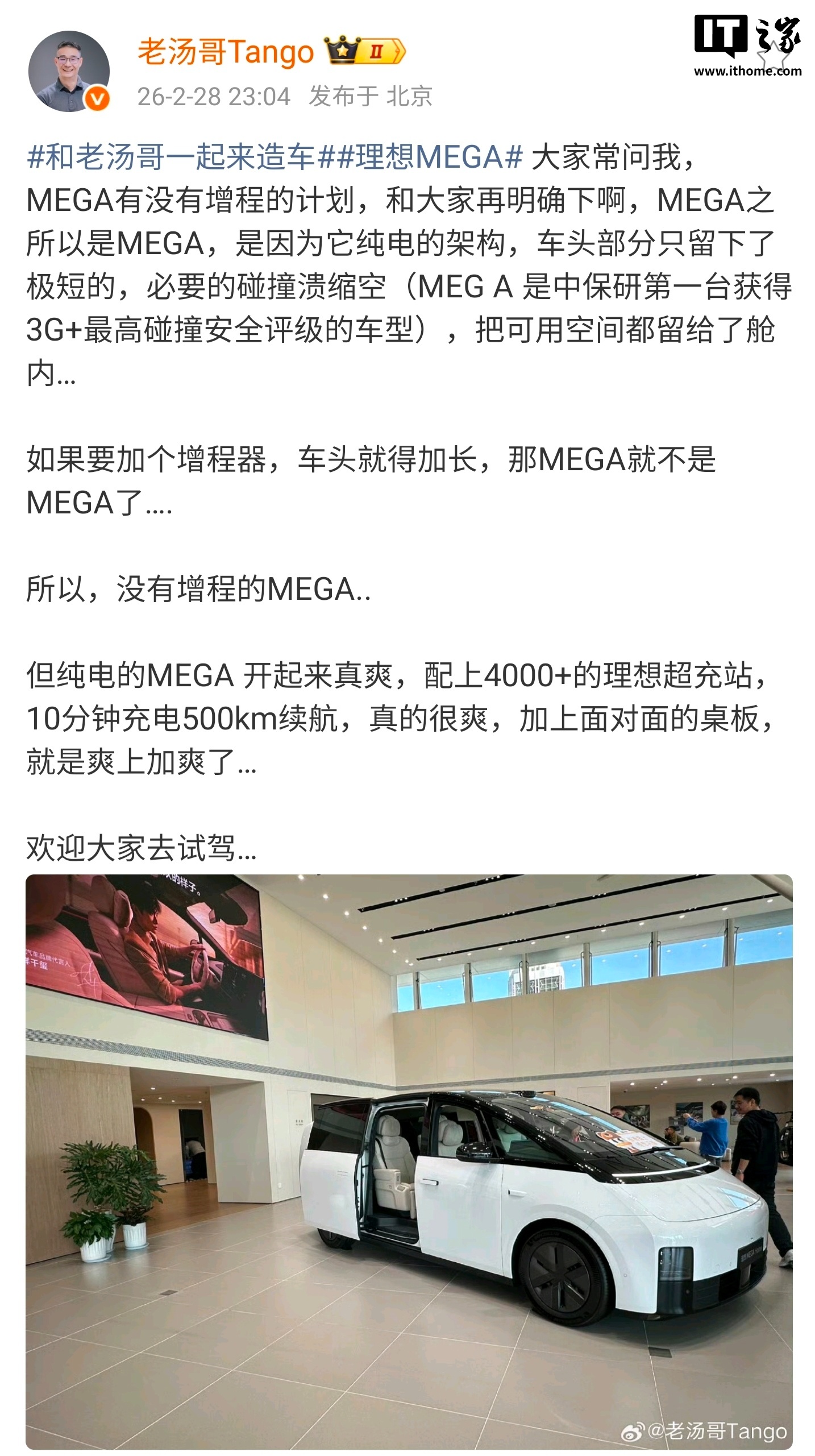 3月1日,理想汽车产品线负责人汤靖确认,理想MEGA车型将不会推出增程版,该车型基于纯电架构设计,车头部分仅保留必要的碰撞溃缩空间,以最大化舱内可用空间。汤靖强调,若增加增程器,车头需加长,这将改变MEGA的设计初衷。
