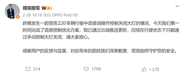 近日,领克Z20车主在无路灯的高速上行驶时,因觉得阅读灯刺眼而通过语音命令关闭所有阅读灯,结果车外大灯也被关闭,导致车辆在黑暗中行驶并最终发生事故。领克官方对此事件进行了道歉,并迅速进行了系统优化。