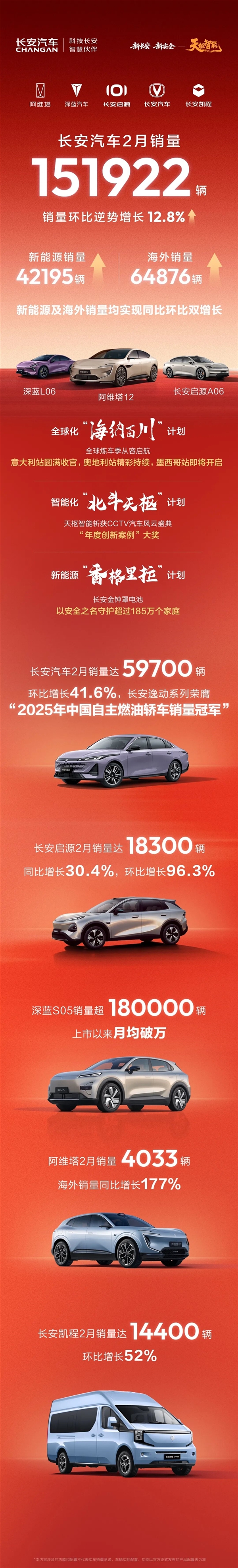 3月2日,长安汽车公布了2月份的产销数据。数据显示,长安汽车2月份总销量为151922辆,环比增长12.8%。在新能源领域,销量达到42195辆,海外销量则为64876辆。具体到品牌,长安汽车品牌销量为59700辆,环比增长41.6%,其中长安逸动系列荣获“2025年中国自主燃油轿车销量冠军”。长安启源销量为18300辆,环比增长96.3%;阿维塔销量为4033辆,凯程销量为14400辆。今年前两个月,长安汽车累计销量达到28.7万辆。