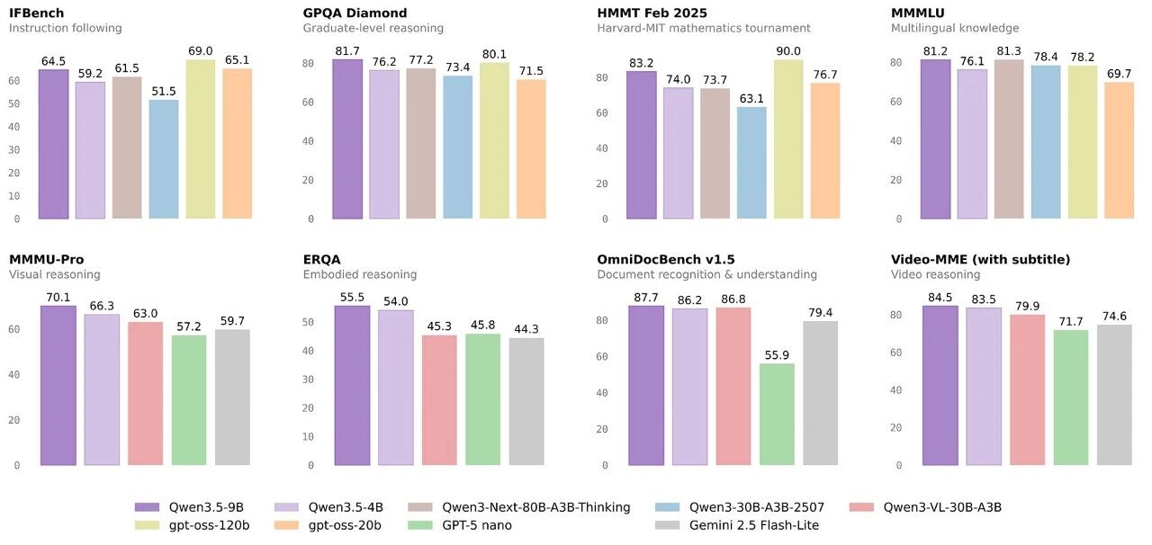 今日,阿里千问宣布开源4款Qwen3.5小尺寸模型系列,包括Qwen3.5-0.8B、2B、4B和9B。这些模型继承了Qwen3.5家族的强大基因,采用原生多模态训练和最新模型架构,以满足不同资源需求的应用场景。0.8B和2B模型以其极致轻量和快速推理速度,特别适合移动设备和IoT边缘设备的部署。4B模型则以其性能强劲和多模态基座模型的特点,适合作为轻量级智能体的核心大脑。9B模型虽然尺寸紧凑,但其性能可媲美gpt-oss-120B,适合显存资源受限但需要较高智力水平的服务器端部署。