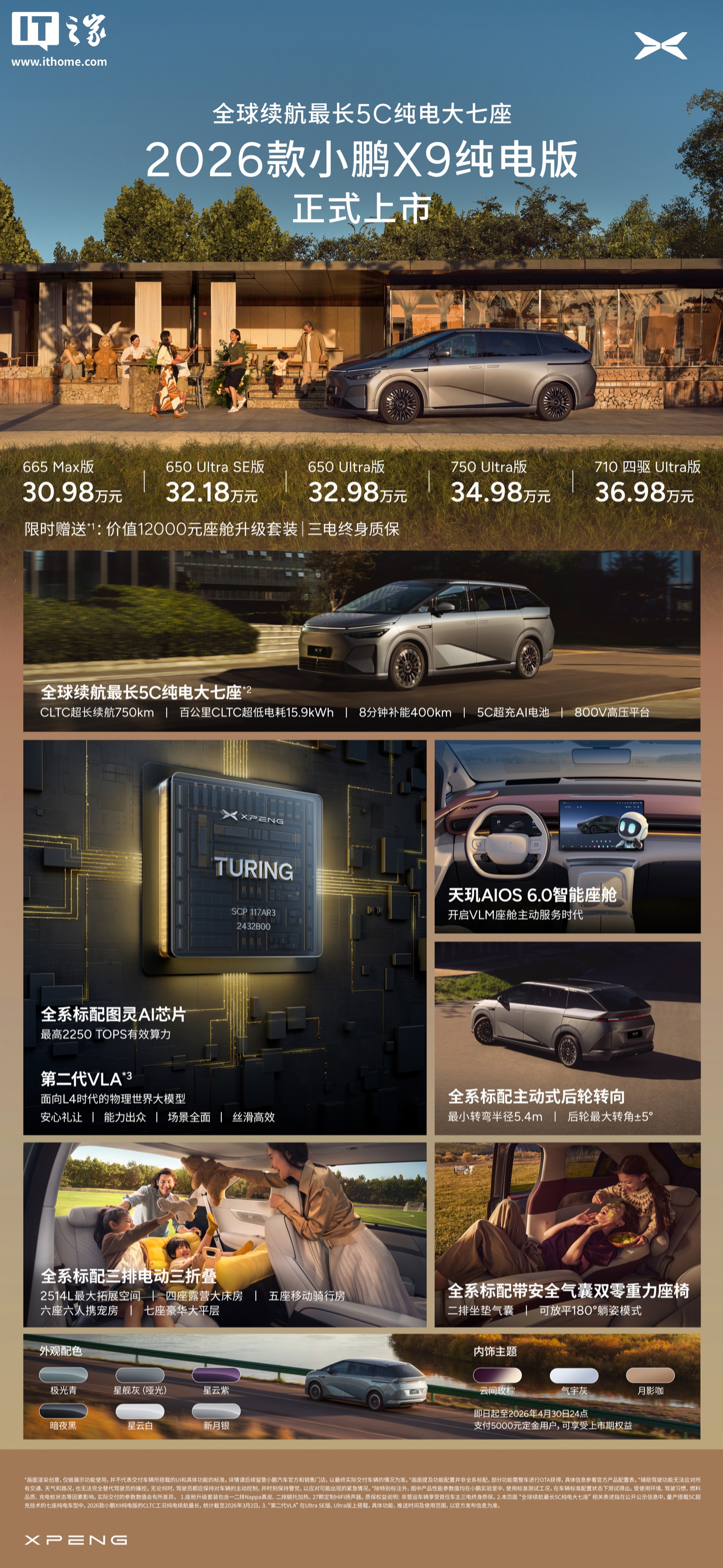2026款小鹏X9纯电版MPV也在3月2日正式上市,被宣称为“全球续航最长5C纯电大七座”。该车型标配5C超充技术,综合电耗百公里15.9kWh,CLTC续航可达750km。全系车型标配图灵芯片,最高有效算力可达2250TOPS,起售价为30.98万元。小鹏X9的上市,标志着小鹏汽车在智能驾驶和电动化领域的进一步发展。