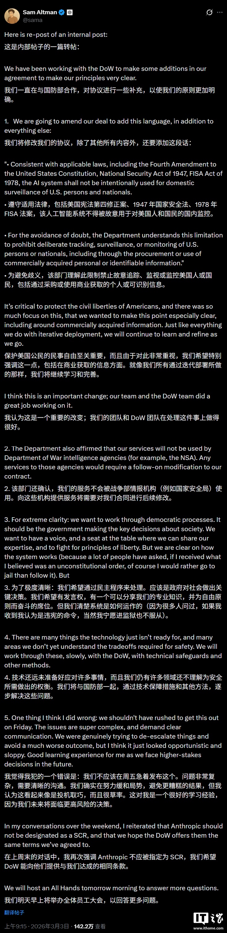 奥尔特曼在内部备忘录中承认,公司在发布这一合作消息时过于匆忙,没有进行清晰的沟通,导致公众误解和不满。他认为这是一个教训,未来在面临更高风险的决策时需要更加谨慎。此前,由于与五角大楼的谈判破裂,美国总统唐纳德·特朗普下令联邦机构停止使用Anthropic的技术,战争部长皮特·赫格塞斯宣布将Anthropic列为供应链风险主体。随后,OpenAI迅速宣布已达成协议,将其模型部署于机密环境。Anthropic和OpenAI均明确表示,其技术绝不用于完全自主武器或大规模国内监控。