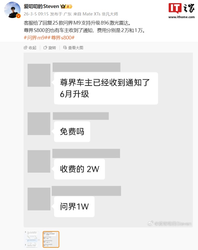 3月5日,华为在鸿蒙智行技术焕新发布会上宣布了全球量产最高的896线激光雷达——新一代双光路图像级激光雷达。同时,搭载该激光雷达的尊界S800和问界M9两款汽车也在当天开启预定,起售价分别为72.8万元和47.98万元。据博主@爱叨叨的Steven透露,2025款问界M9和尊界S800将支持升级华为全新896激光雷达,升级费用分别为1万元和2万元。