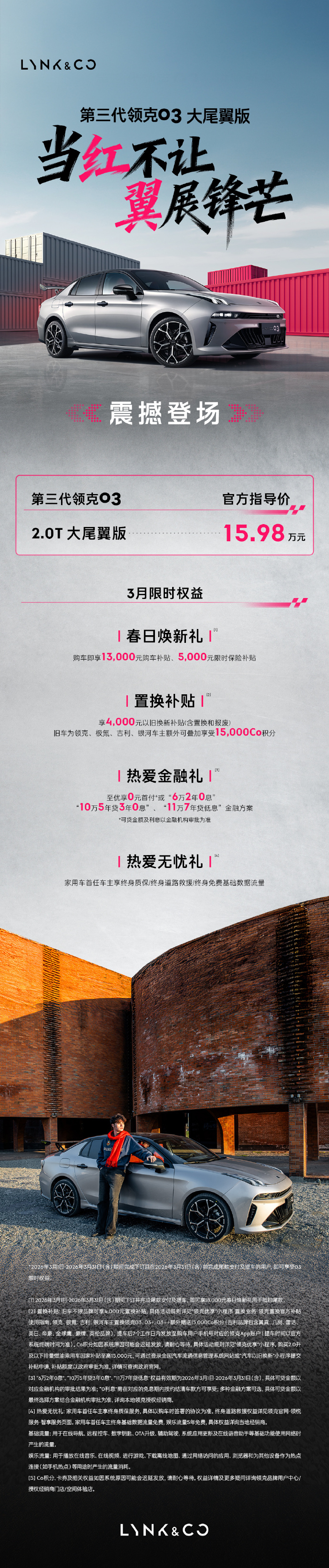 今日,第三代领克03大尾翼版正式上市,市场指导价为15.98万元,并推出3月限时权益。新车搭载2.0TDT5Evo