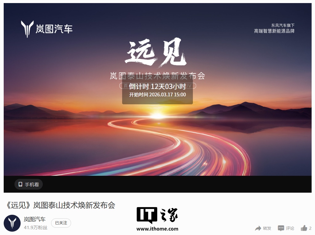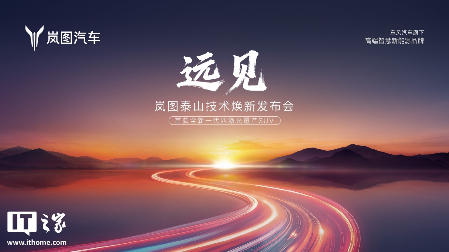 今日,岚图汽车官方微博宣布,将举办名为《远见》的岚图泰山技术焕新发布会直播,宣传图透露,岚图汽车将带来首款全新一代四激光量产SUV。值得注意的是,发布会直播时间定于2026年3月17日15:00。此前报道,岚图汽车科技股份有限公司董事长卢放宣布,3月将正式上市中国首款量产L3级SUV——岚图泰山黑武士。新车将搭载华为最顶级的乾崑智驾ADS四激光方案,该方案基于对环境的精准感知,能够向周围传递信号、沟通意图,实现感知与预判能力的全面跃迁。