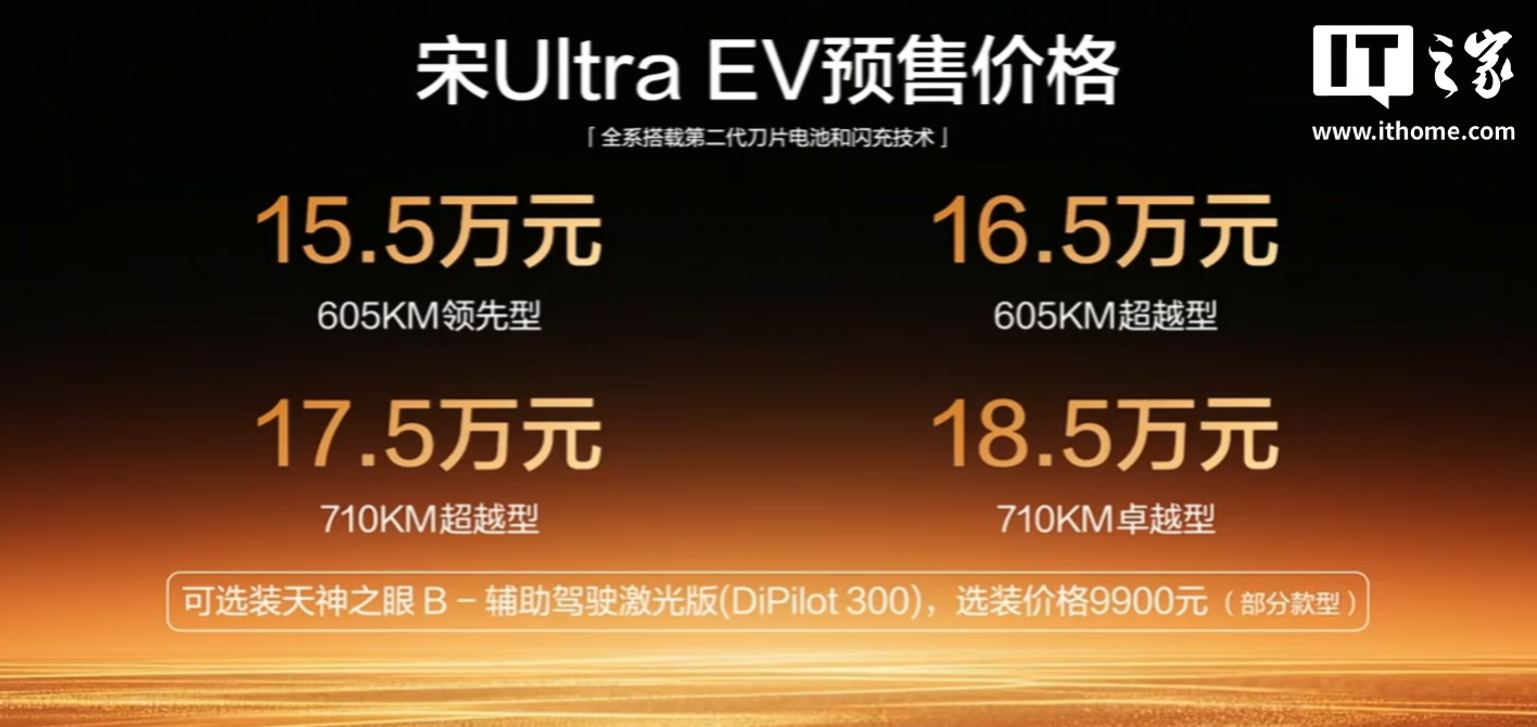 3月5日,比亚迪王朝系列首款B级纯电SUV宋Ultra EV车型正式发布,预售价15.5万元起,预计3月底上市。该车型提供605km和710km两种续航版本,价格从15.5万元至18.5万元不等。部分款型可选装天神之眼B激光雷达版,选装价格为9900元。预售期间,用户将获得额外6个月的免费闪充权益,总计18个月。比亚迪宋Ultra EV搭载比亚迪闪充技术、第二代刀片