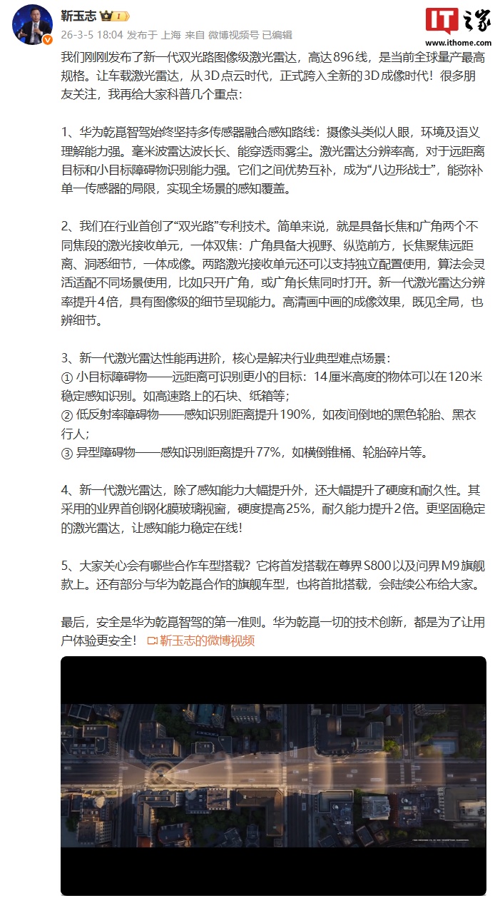 靳玉志强调,华为乾崑智驾坚持多传感器融合感知路线,通过各传感器的优势互补,实现全场景感知覆盖。摄像头、毫米波雷达和激光雷达的组合,分别在环境理解、穿透能力和远距离目标识别上发挥重要作用。华为乾崑新一代双光路图像级激光雷达将首发搭载在尊界S800和问界M9旗舰款上,部分与华为乾崑合作的旗舰车型也将首批搭载,具体车型将陆续公布。