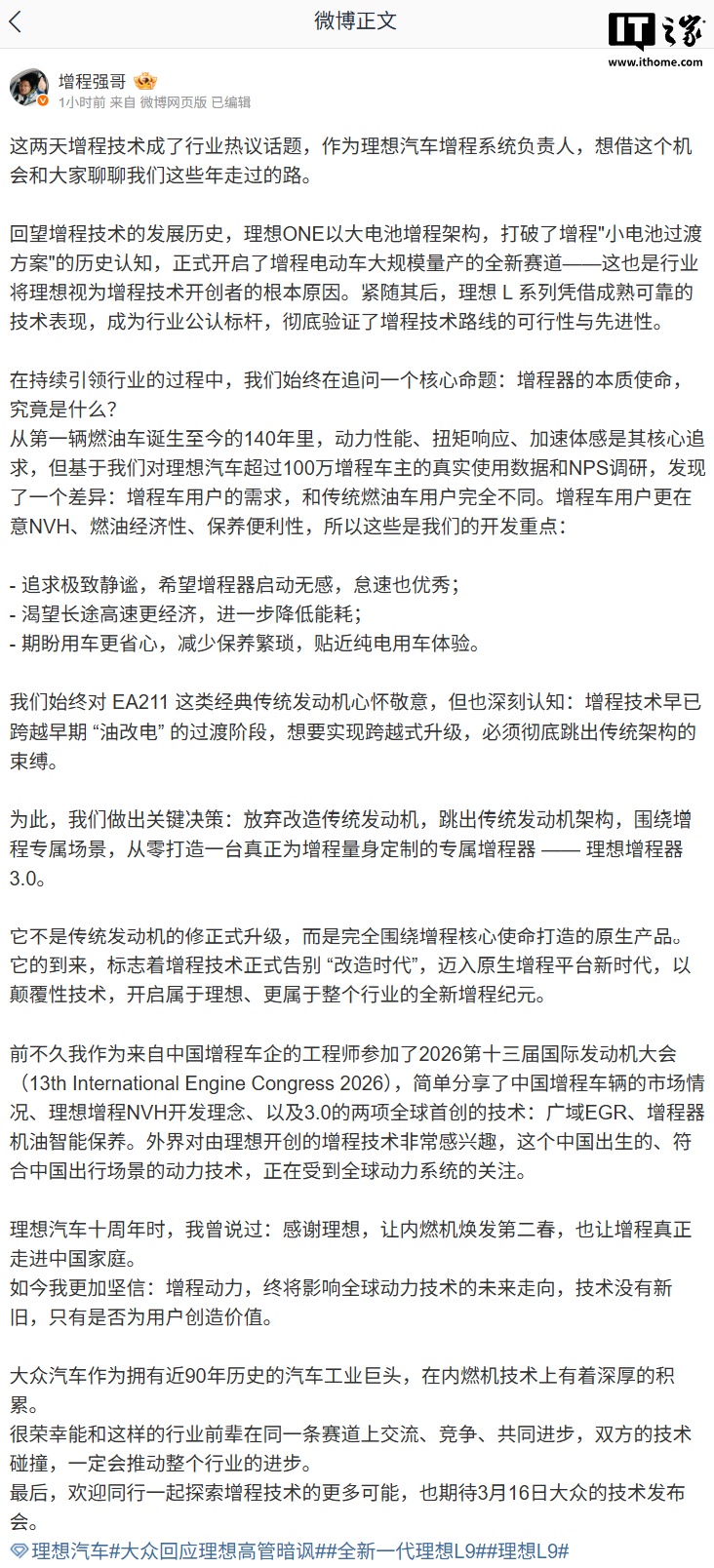 根据工信部申报信息,上汽大众ID.ERA9X搭载65.2kWh大容量电池,CLTC纯电续航超400km。理想汽车增程系统负责人@增程强哥发文谈到了这款产品,他表示,理想增程3.0不是传统发动机的修正式升级,而是完全围绕增程核心使命打造的原生产品,标志着增程技术正式告别“改造时代”,迈入原生增程平台新时代。