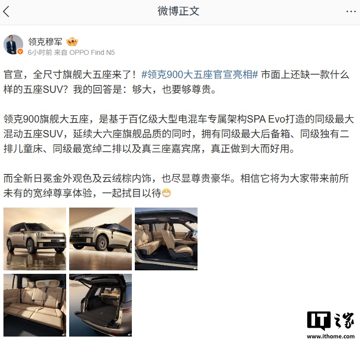 今日,领克汽车宣布其全尺寸旗舰大五座SUV领克900正式亮相,并展示了全新的“日冕金”车色。领克900是基于百亿级大型电混车专属架构SPAEvo打造,定位为同级最大混动五座SUV。该车型不仅延续了大六座旗舰的品质,还拥有同级最大的后备箱空间、独有的二排儿童床设计、同级最宽绰的二排空间以及真三座嘉宾席。领克900的外观采用全新日冕金配色,内饰则为云绒棕色调。