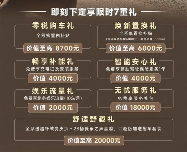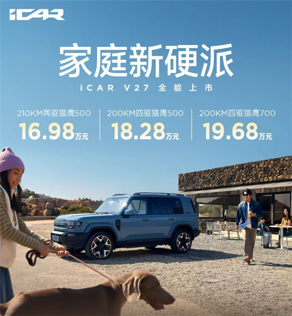 3月13日,奇瑞iCar品牌旗下全新SUV车型V27正式上市,售价区间为16.98-19.68万元,直接对标比亚迪方程豹钛7。V27采用全新设计语言,以方盒子造型和硬汉风格为特点,车身尺寸为4909/5055*1976*1855/1894mm,轴距2910mm,定位中大型SUV。车内设计简约科技,配备15.4英寸中控屏和8.88英寸液晶仪表,搭载高通骁龙8295P芯片,支持四音区识别和多种手机互联功能。