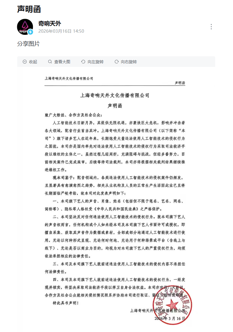 奇响天外表示,对于违法使用人工智能技术的侵权内容,公司及艺人不承担任何法律责任,并将在发现侵权行为后坚决采取司法救济手段。同时,公司呼吁粉丝、合作方及公众协助取证、投诉或举报侵权情况。奇响天外成立于2016年,业务包括演出经纪、文化艺术交流等,曾为《唐山葬》《原神》等知名IP提供配音服务。